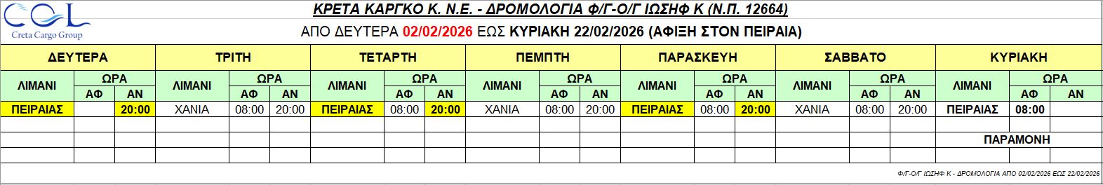 Φ/Γ-Ο/Γ “ΙΩΣΗΦ Κ”:  Σας γνωρίζουμε τα δρομολόγια που θα εκτελέσει το πλοίο μας από Δευτέρα 02/02/2026 έως Κυριακή 22/02/2026 ως κάτωθι πίνακας: