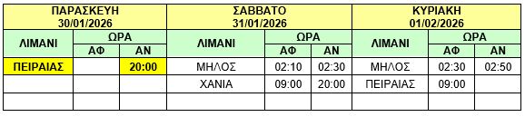 Φ/Γ-Ο/Γ “ΙΩΣΗΦ Κ”: Προς εξυπηρέτηση συγκοινωνιακών αναγκών, σας γνωρίζουμε ότι στο δρομολόγιο της Παρασκευής 30/01/2026 του πλοίου μας Φ/Γ-Ο/Γ «ΙΩΣΗΦ Κ» από ΠΕΙΡΑΙΑ προς ΧΑΝΙΑ θα προστεθεί και η προσέγγιση του λιμένα της ΜΗΛΟΥ κατά μετάβαση και επιστροφή και το δρομολόγιο θα εκτελεστεί ως κάτωθι πίνακας :
