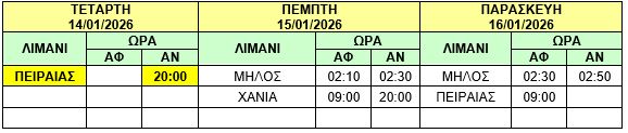 Φ/Γ-Ο/Γ “ΙΩΣΗΦ Κ”: Προς εξυπηρέτηση συγκοινωνιακών αναγκών, σας γνωρίζουμε ότι στο δρομολόγιο της Τετάρτης 14/01/2026 του πλοίου μας Φ/Γ-Ο/Γ «ΙΩΣΗΦ Κ» από ΠΕΙΡΑΙΑ προς ΧΑΝΙΑ θα προστεθεί και η προσέγγιση του λιμένα της ΜΗΛΟΥ κατά μετάβαση και επιστροφή και το δρομολόγιο θα εκτελεστεί ως κάτωθι πίνακας :