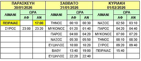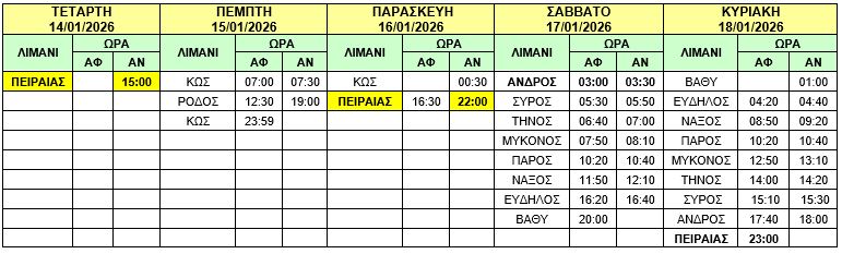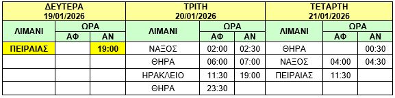 Φ/Γ-Ο/Γ “ΝΕΑΡΧΟΣ Κ”: Προς εξυπηρέτηση συγκοινωνιακών αναγκών, σας γνωρίζουμε ότι στο σημερινό δρομολόγιο Δευτέρας 19/01/2026 του πλοίου Φ/Γ-Ο/Γ «ΝΕΑΡΧΟΣ Κ» από ΠΕΙΡΑΙΑ στις 19:00 προς ΘΗΡΑ – ΗΡΑΚΛΕΙΟ θα προστεθεί προσέγγιση στο λιμένα της ΝΑΞΟΥ κατά μετάβαση και επιστροφή και το δρομολόγιο θα εκτελεστεί ως κάτωθι πίνακας :