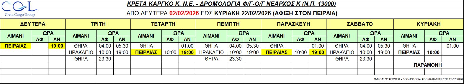 Φ/Γ-Ο/Γ “ΝΕΑΡΧΟΣ Κ”:  Σας γνωρίζουμε τα δρομολόγια που θα εκτελέσει το πλοίο μας από Δευτέρα 02/02/2026 έως Κυριακή 22/02/2026 ως κάτωθι πίνακας: