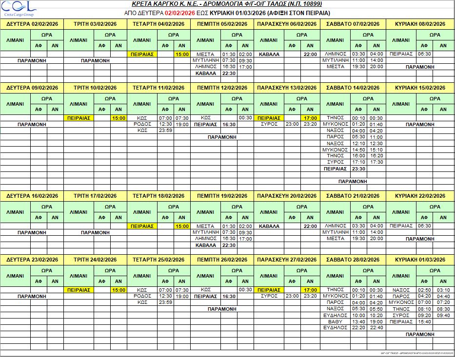 Φ/Γ-Ο/Γ “ΤΑΛΩΣ”:  Σας γνωρίζουμε τα δρομολόγια που θα εκτελέσει το πλοίο μας από Δευτέρα 02/02/2026 έως Κυριακή 01/03/2026 ως κάτωθι πίνακας: