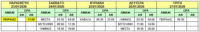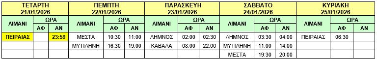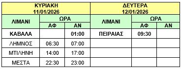 γ) Το πλοίο Φ/Γ-Ο/Γ «ΤΑΛΩΣ» θα αναχωρήσει αύριο Κυριακή 11/01/2026 από ΚΑΒΑΛΑ στις 01:00 (αντί σήμερα Σάββατο 10/01/2026 στις 14:00) προς ΛΗΜΝΟ – ΜΥΤΙΛΗΝΗ – ΜΕΣΤΑ – ΠΕΙΡΑΙΑ και το δρομολόγιο θα εκτελεστεί ως κάτωθι πίνακας :