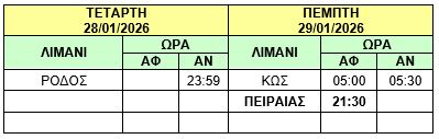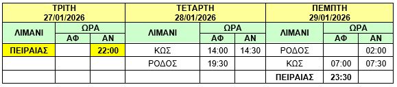 Φ/Γ-Ο/Γ “ΤΑΛΩΣ”: Λόγω δυσμενών καιρικών συνθηκών και καθυστερημένου κατάπλου του πλοίου Φ/Γ-Ο/Γ «ΤΑΛΩΣ» στον ΠΕΙΡΑΙΑ, σας γνωρίζουμε ότι το ανωτέρω πλοίο θα αναχωρήσει σήμερα Τρίτη 27/01/2026 από ΠΕΙΡΑΙΑ στις 22:00 (αντί στις 15:00) προς ΚΩ – ΡΟΔΟ και το δρομολόγιο θα εκτελεστεί ως κάτωθι πίνακας :
