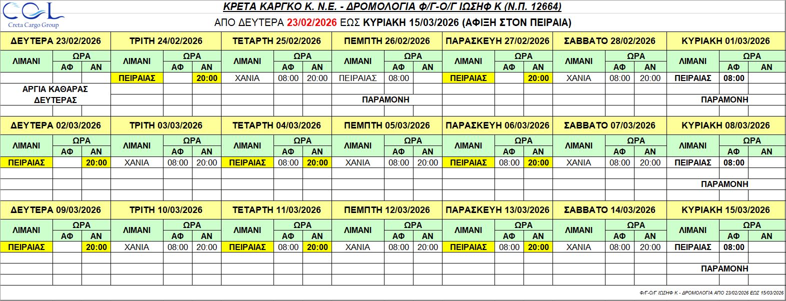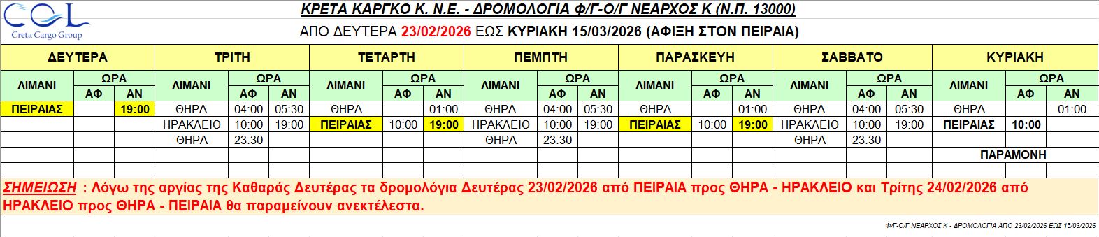 Φ/Γ-Ο/Γ “ΝΕΑΡΧΟΣ Κ”:  Σας γνωρίζουμε τα δρομολόγια που θα εκτελέσει το πλοίο μας από Δευτέρα 23/02/2026 έως Κυριακή 15/03/2026 ως κάτωθι πίνακας: