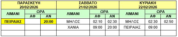 Φ/Γ-Ο/Γ “ΙΩΣΗΦ Κ”: Προς εξυπηρέτηση συγκοινωνιακών αναγκών, σας γνωρίζουμε ότι στο δρομολόγιο της Παρασκευής 20/02/2026 του πλοίου μας Φ/Γ-Ο/Γ «ΙΩΣΗΦ Κ» από ΠΕΙΡΑΙΑ προς ΧΑΝΙΑ στις 20:00 θα προστεθεί και η προσέγγιση του λιμένα της ΜΗΛΟΥ κατά μετάβαση και επιστροφή και το δρομολόγιο θα εκτελεστεί ως κάτωθι πίνακας :