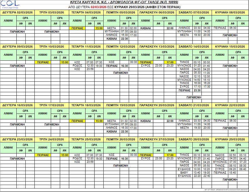 Φ/Γ-Ο/Γ “ΤΑΛΩΣ”:  Σας γνωρίζουμε τα δρομολόγια που θα εκτελέσει το πλοίο μας από Δευτέρα 02/03/2026 έως Κυριακή 29/03/2026 ως κάτωθι πίνακας: