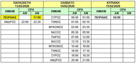 Φ/Γ-Ο/Γ “ΤΑΛΩΣ”: Προς εξυπηρέτηση μεταφοράς βυτίων καυσίμων στην ΑΝΔΡΟ, σας γνωρίζουμε ότι στο δρομολόγιο της Παρασκευής 13/02/2026 του πλοίου μας Φ/Γ-Ο/Γ «ΤΑΛΩΣ» από τον ΠΕΙΡΑΙΑ στις 17:00 προς ΣΥΡΟ – ΤΗΝΟ – ΜΥΚΟΝΟ – ΝΑΞΟ – ΠΑΡΟ, θα προστεθεί προσέγγιση στην ΑΝΔΡΟ κατά μετάβαση και επιστροφή, και το δρομολόγιο θα εκτελεστεί ως κάτωθι πίνακας: