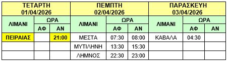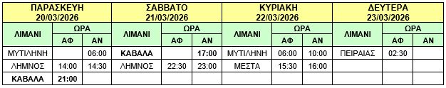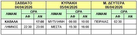 Φ/Γ-Ο/Γ “ΤΑΛΩΣ”: Λόγω δυσμενών καιρικών συνθηκών και καθυστερημένου κατάπλου του πλοίου μας Φ/Γ-Ο/Γ «ΤΑΛΩΣ» στο λιμένα της ΚΑΒΑΛΑΣ, σας γνωρίζουμε ότι το ανωτέρω πλοίο θα αναχωρήσει από ΚΑΒΑΛΑ αύριο Σάββατο 04/04/2026 από ΚΑΒΑΛΑ στις 17:00 (αντί σήμερα Παρασκευή 03/04/2026 στις 22:00) προς ΛΗΜΝΟ – ΜΥΤΙΛΗΝΗ – ΜΕΣΤΑ – ΠΕΙΡΑΙΑ και το δρομολόγιο θα εκτελεστεί ως κάτωθι πίνακας :