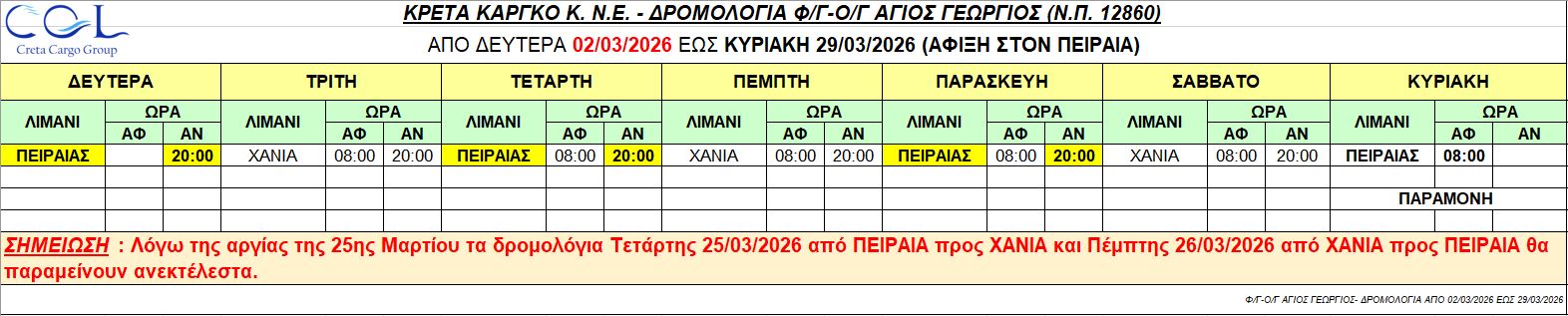Φ/Γ-Ο/Γ ΑΓΙΟΣ ΓΕΩΡΓΙΟΣ: Λόγω της αργίας της 25ης Μαρτίου, σας γνωρίζουμε ότι το πλοίο μας Φ/Γ-Ο/Γ «ΑΓΙΟΣ ΓΕΩΡΓΙΟΣ» θα παραμείνει στο λιμένα των ΧΑΝΙΩΝ από την Τρίτη 24/03/2026 έως την Πέμπτη 26/03/2026, όπου και θα αναχωρήσει στις 20:00 με άφιξη στον ΠΕΙΡΑΙΑ την Παρασκευή 27/03/2026 στις 08:00.