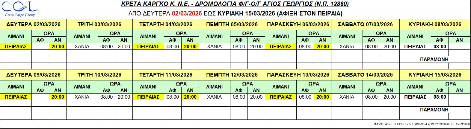 Φ/Γ-Ο/Γ “ΑΓΙΟΣ ΓΕΩΡΓΙΟΣ”:  Σας γνωρίζουμε τα δρομολόγια που θα εκτελέσει το πλοίο μας από Δευτέρα 02/03/2026 έως Κυριακή 29/03/2026 ως κάτωθι πίνακας: