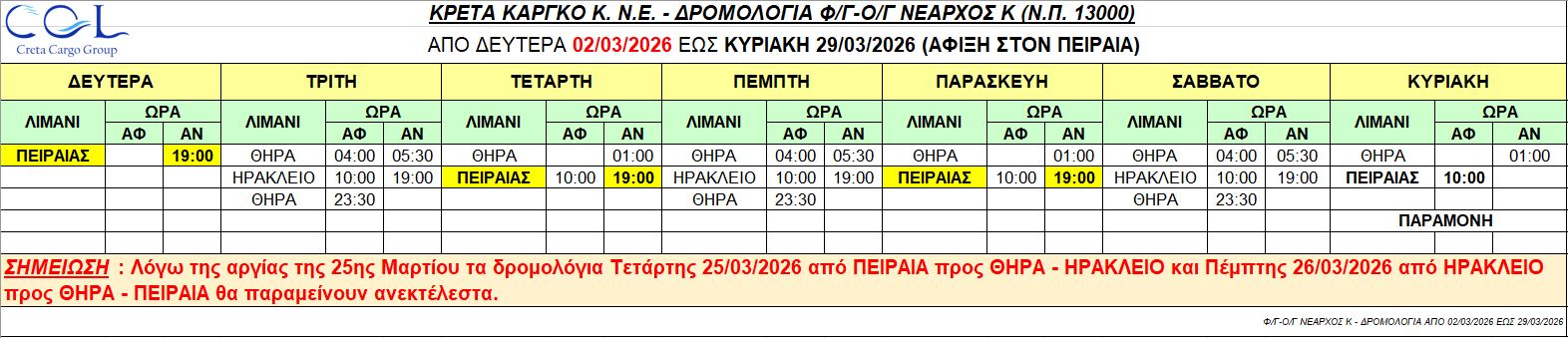 Φ/Γ-Ο/Γ “ΝΕΑΡΧΟΣ Κ”:  Σας γνωρίζουμε τα δρομολόγια που θα εκτελέσει το πλοίο μας από Δευτέρα 02/03/2026 έως Κυριακή 29/03/2026 ως κάτωθι πίνακας: